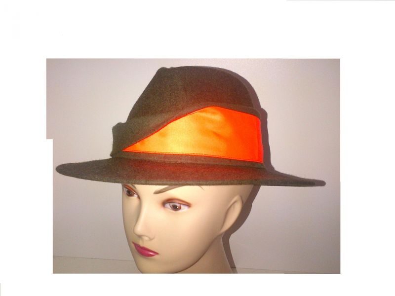 Imprägnierter Lodenjagdhut mit Signalband. Der praktische Kopfschutz für jede Treibjagd wo Signalbänder Pflicht sind.